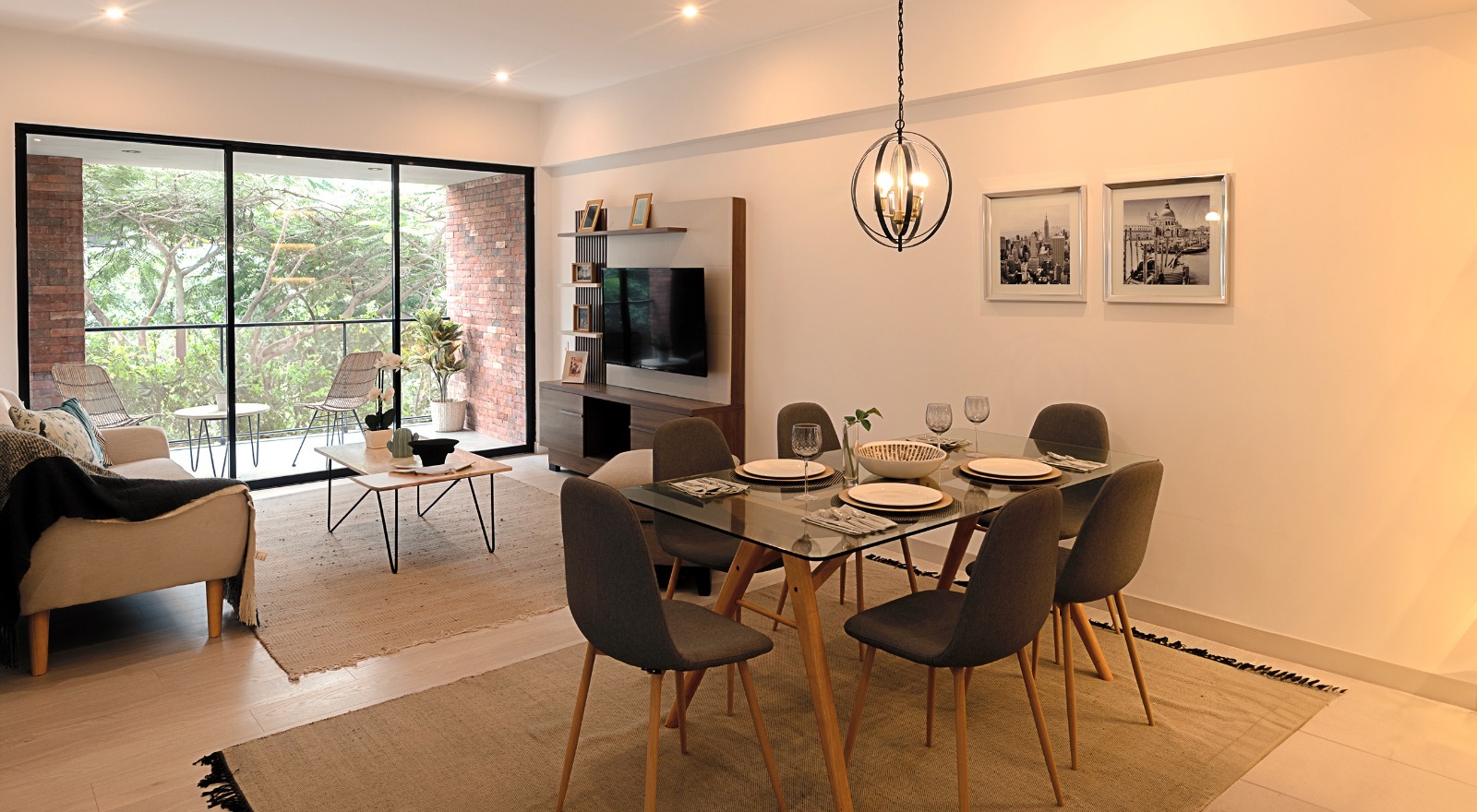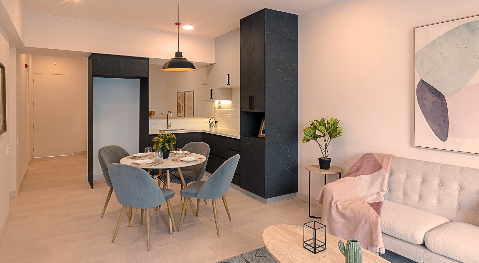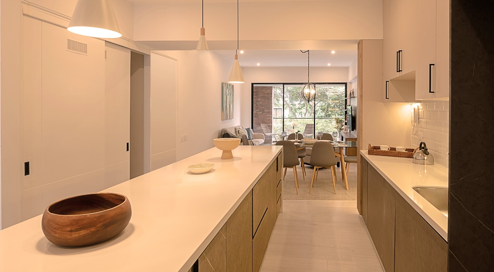 Acabados de lujo en tonos claros con carpintería y detalles negros que armonizan con el estilo industrial exterior.