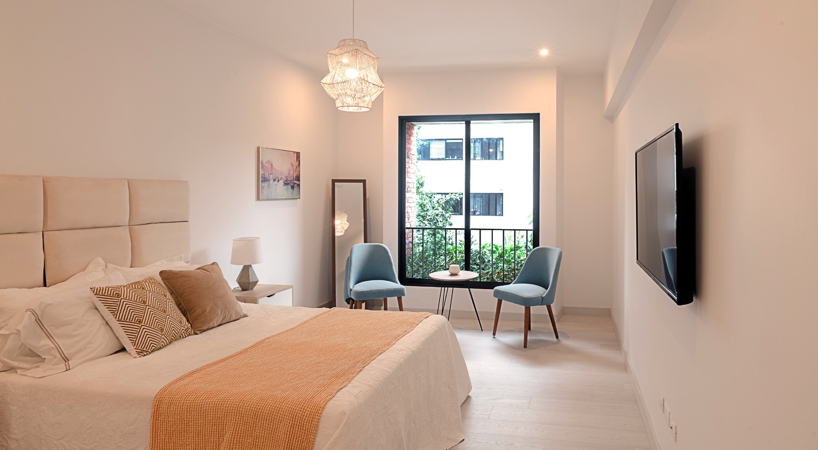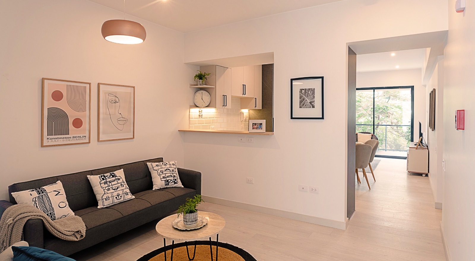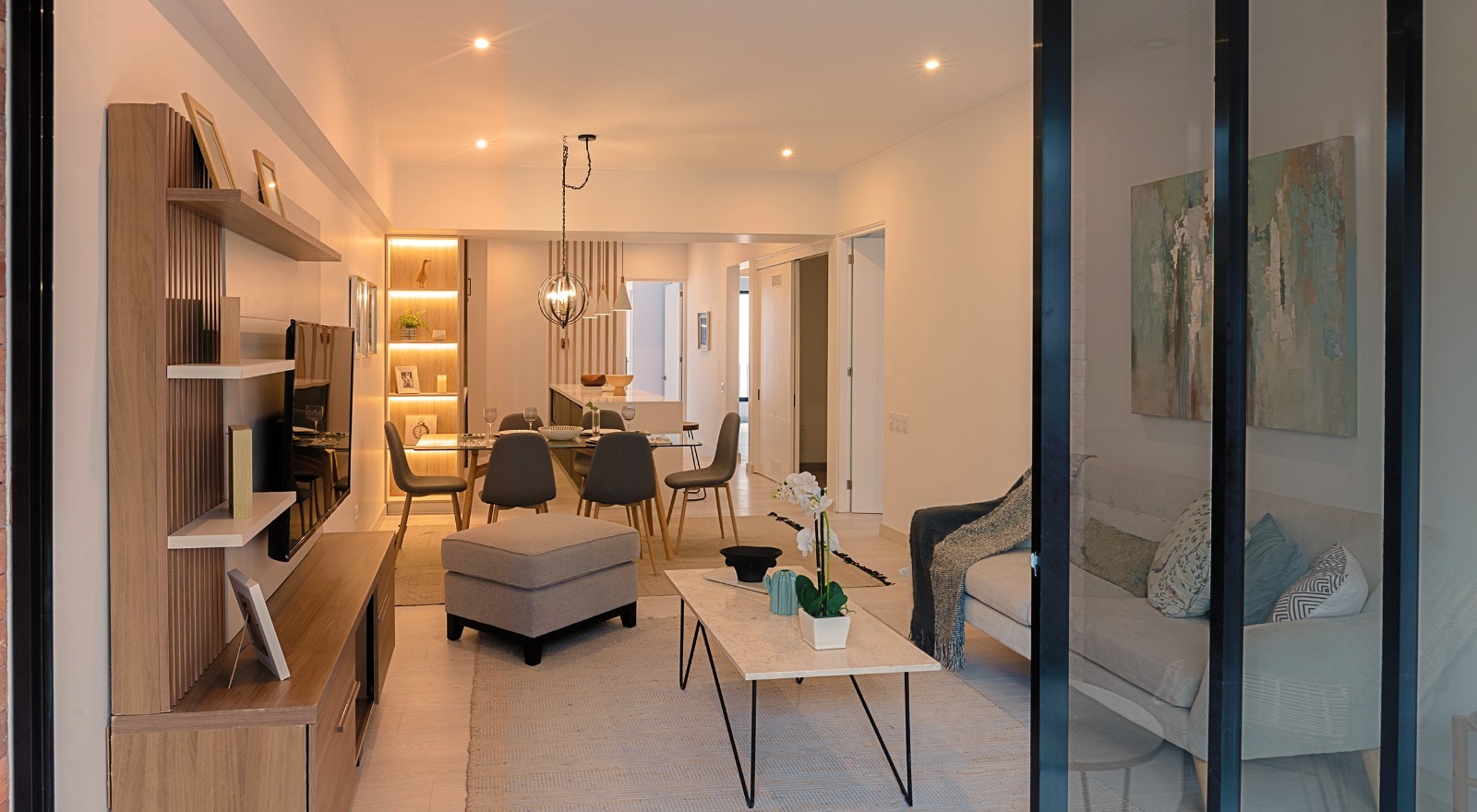 Acabados de lujo en tonos claros con carpintería y detalles negros que armonizan con el estilo industrial exterior.
