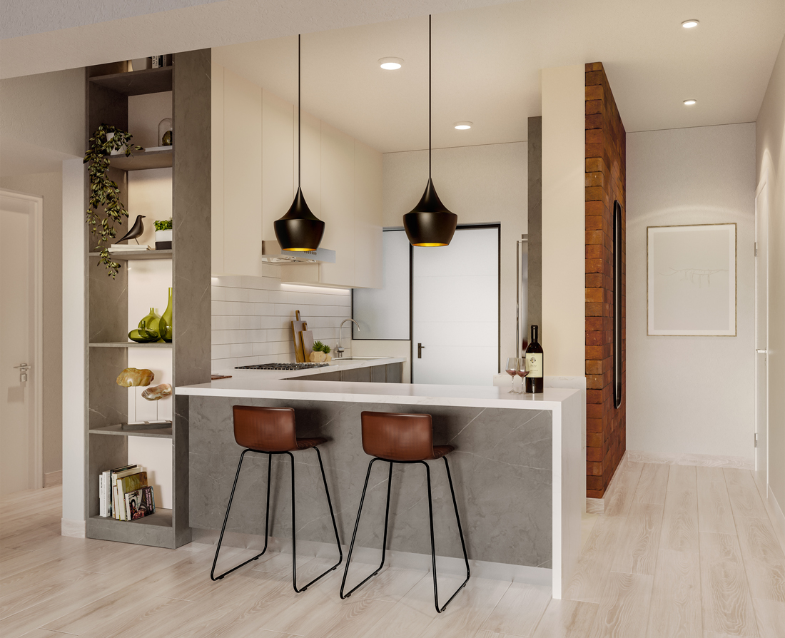 Concepto de cocina abierta que la integra con la sala comedor, dando un ambiente más cómodo, flexible y relajado
