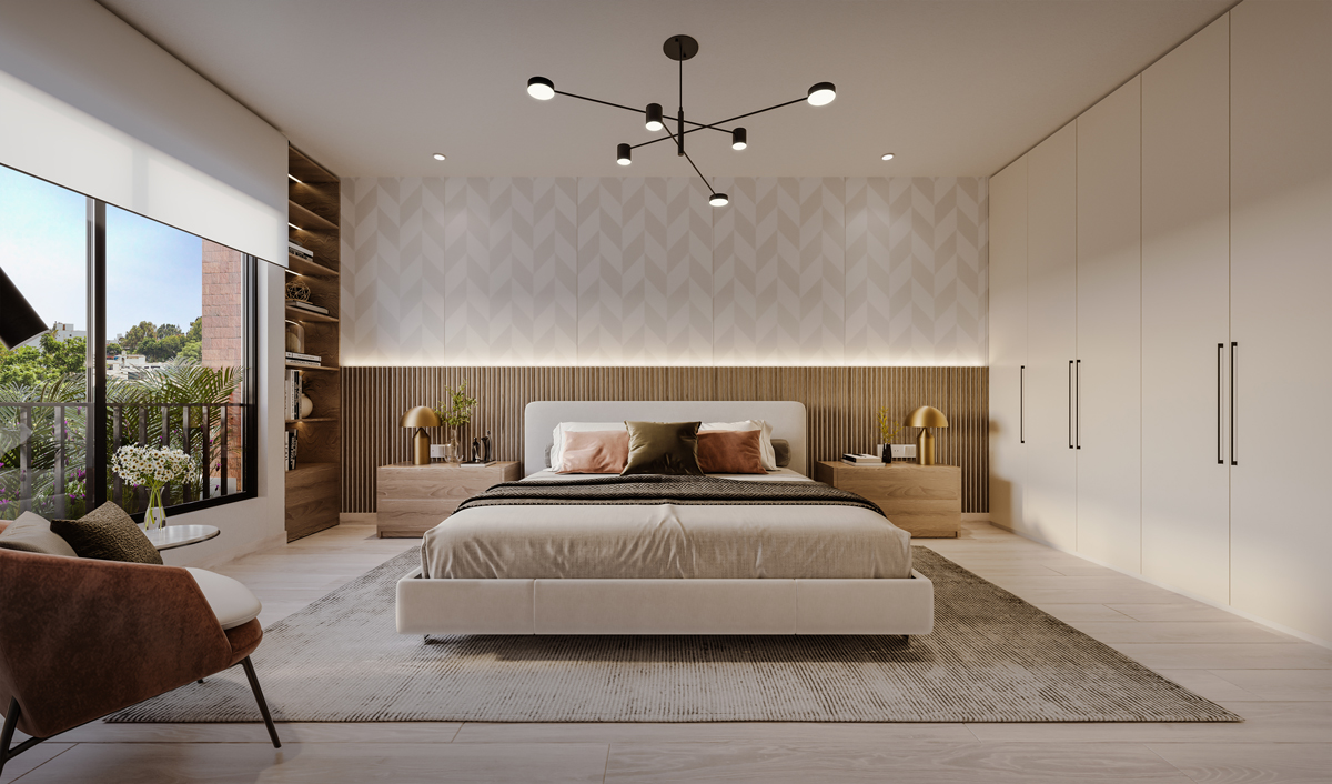 Dormitorio principal con jardineras que brindan privacidad del exterior y aportan verde al dormitorio.